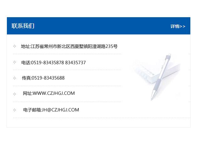 地址:常州市新北區友邦商務大廈1幢16、17層  電話:0519-85101652  傳真:0519-85112595  郵編:213022  網址:www.cz-jiayue_cn.hongdawd.com  郵箱:xiajifengaa@163.com